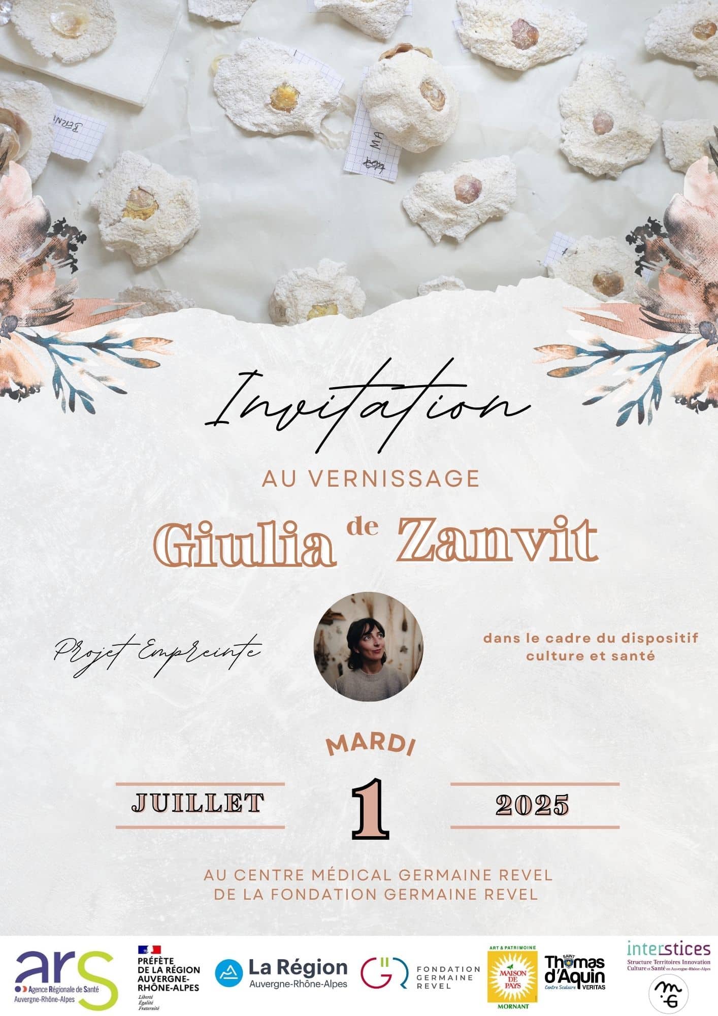 Dans le cadre du dispositif Culture et Santé, la Fondation Germaine Revel a le plaisir de vous inviter au vernissage du Projet Empreinte, menée par l’artiste Giulia Zanvit.